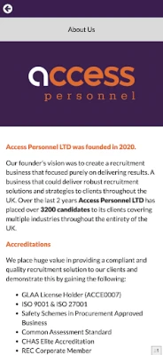 At Access Personnel LTD we pride ourselves on delivering an outstanding service to both business and candidates. We demonstrate this with the accreditations we gain, National Living Wage Employer, ISO: 9001, ISO: 27001, GLAA Licence Holder: ACCE0007, CHAS Elite Status, SSIP, Common Assessment Standard and Corporate REC Membership.