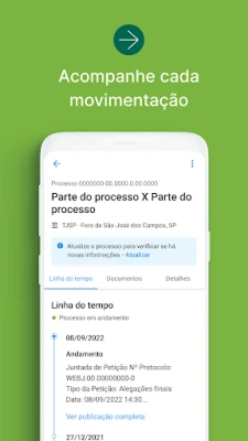 - Visualize todos os tipos de movimentações como publicações e intimações, em formato de linha do tempo